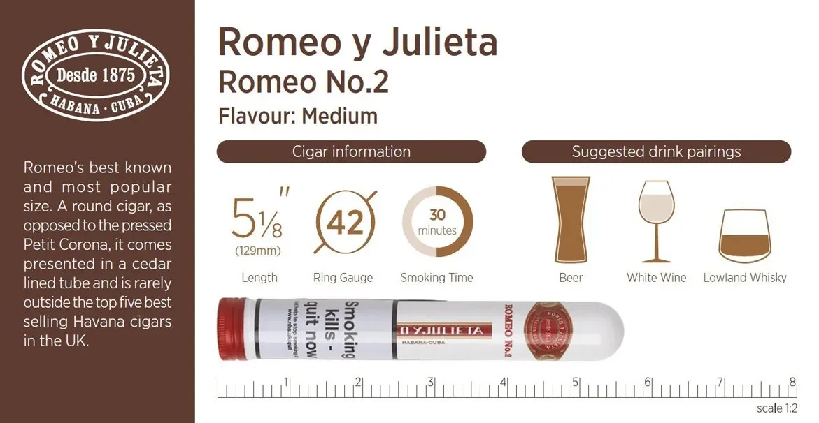 Tüplü format, puroların taze ve kaliteli kalmasını sağlar. Hafif gövdeli yapısı ve dengeli aroması, her seviyeden puro severin rahatça keyfini çıkarabileceği bir içim sunar. Romeo y Julieta No 2, tatlı ve kremamsı notalarla başlayıp, ilerleyen kısımlarda zengin ve baharatlı tatlar sunar.